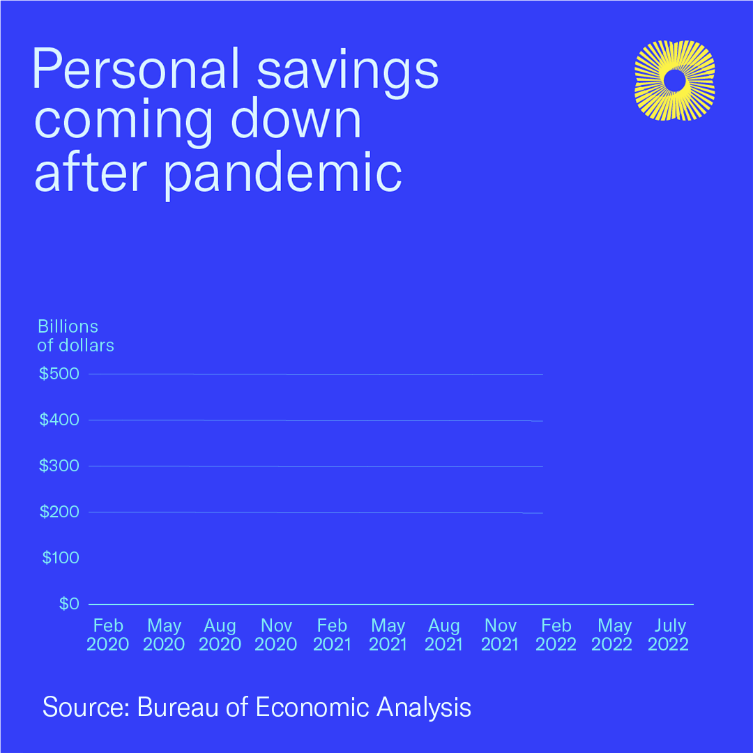 Enhanced unemployment insurance and pandemic relief checks helped facilitate historic savings during the pandemic—as did the limited options for spending those savings as many normal spending options were unavailable, or significantly limited. Although those savings are coming down, in total, Americans saved about $2.7 trillion during the pandemic, 10% of the nation’s GDP.