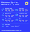 Debt levels declined during the pandemic, especially credit card debt. The drop in debt and rise in savings put consumers’ personal balance sheets in a strong position. However, debt levels are starting to rise as prices rise because of high inflation, the end of government pandemic benefits, and an increase in spending now that pandemic restrictions are mostly over.
