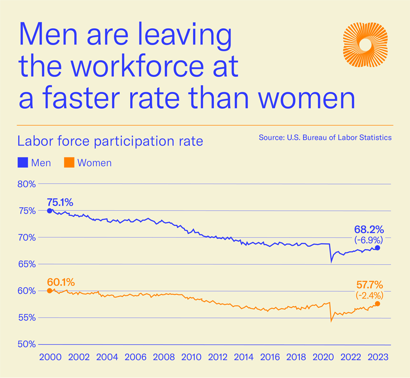 As we saw in the pandemic, women, by and large, leave the labor force to take care of children or loved ones. Explanations for the decline of labor force participation for prime age men (ages 25 to 54), vary, including skills mismatch and going to school.