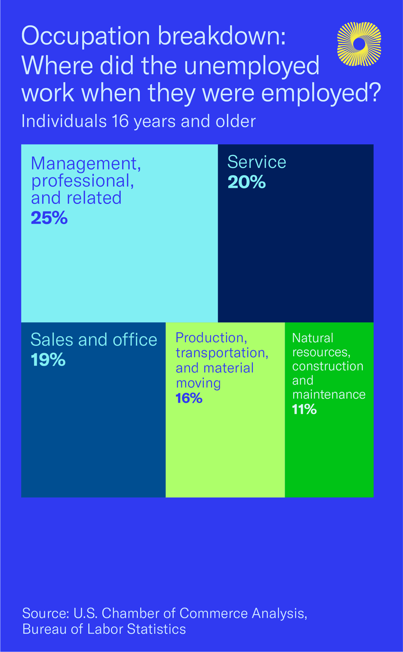 Nearly 40% of all unemployed individuals in October 2022 previously worked in service and sales and office occupations. A quarter worked in the wholesale and retail trade and leisure and hospitality sectors.