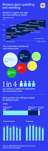 Employers can consider reskilling or upskilling any person in their workforce despite experience, age, or education level. Workers in higher risk jobs like those in the service industries are the most inclined to reskill, but even those in historically safe jobs, like law, social work, and health care, are willing to reskill or upskill.