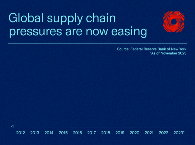 Pressure on the global supply chain was stable for years leading up to the pandemic. It spiked during the pandemic but has come down since. It is now near pre-pandemic levels.