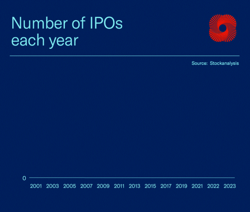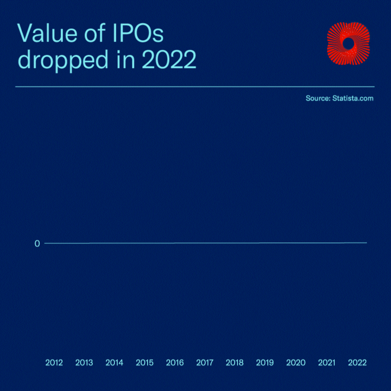 The 94.2% drop in dollar value of IPOs in 2022, the most recent year for which data is available, is mostly the result of SPACs falling off. Fewer IPOs, aside from the drop in SPACs, also played a role, albeit smaller.