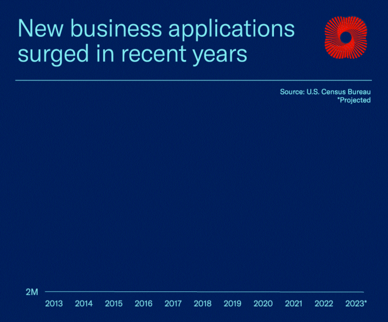The surge in entrepreneurship has continued through 2022 and 2023. The total number of new business applications for 2023 is projected to be even higher at 5.5 million.